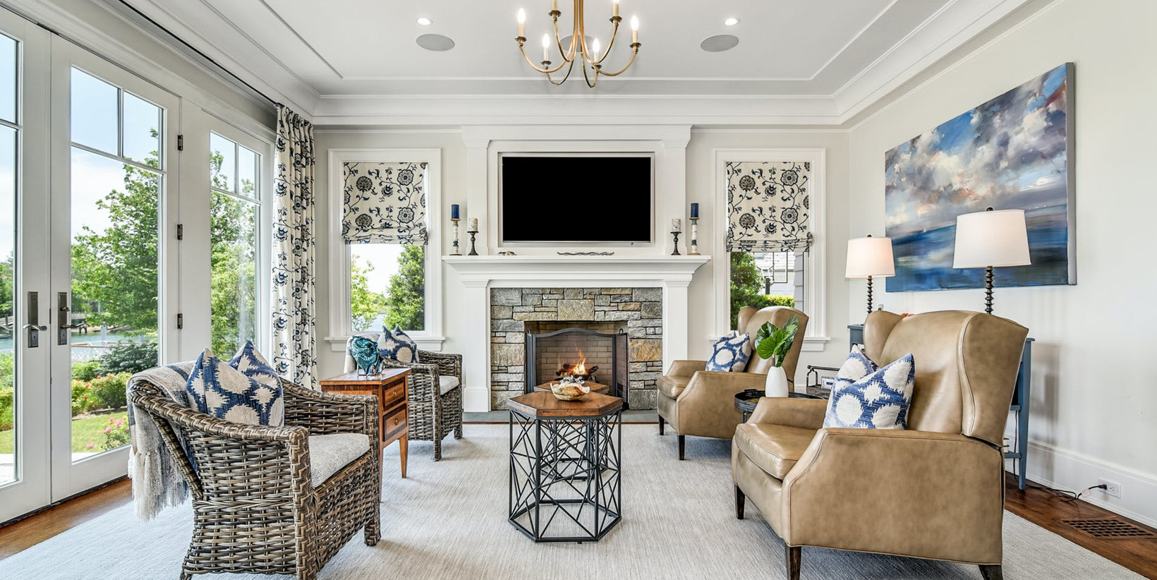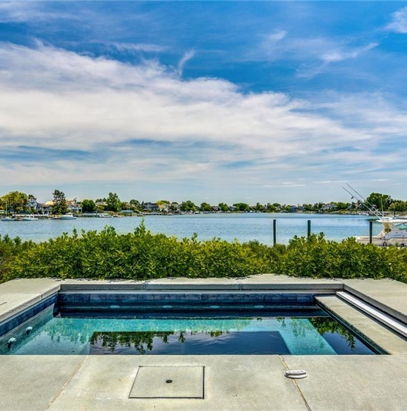 Several French doors open to verandas which overlook the spa, landscape and dock.